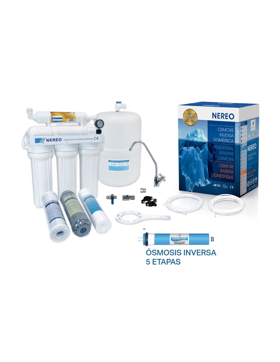 NEREO ÓSMOSIS INVERSA DOMÉSTICA Ósmosis inversa 5 etapas para la producción de agua pura, con bajo contenido en sales. Fabricada con materiales de alta calidad, la ósmosis inversa NEREO ofrece una excelente combinación de calidad con simplicidad y funcionalidad. Etapas: filtración 5 μm, carbón GAC, carbón block, (opción bomba booster), membrana y post-filtro. • Carbón activo 100% cáscara de coco • Membrana 50 GPD Certificado NSF/ANSI Standard 058 • Post-filtro antibacterias nano partículas • Incluye grifo Margarita • Incluye manómetro • Alto flujo de agua: Tubing de 3/8” • Tubing antibacterias certificado por SGS • Llave multiusos 5 en 1 • Depósito de acumulación de 4 galones • Kit de instalación • Presión de trabajo: - Equipo con bomba: 1 a 3 Bar - Equipo sin bomba: 2,5 a 4,2 Bar • Temperatura de entrada: 5 a 35 ºC • TDS máximo de entrada: 1.000 ppm • Equipo con bomba: - Tensión eléctrica: 220 – 24VDC - Bomba booster LF-30L